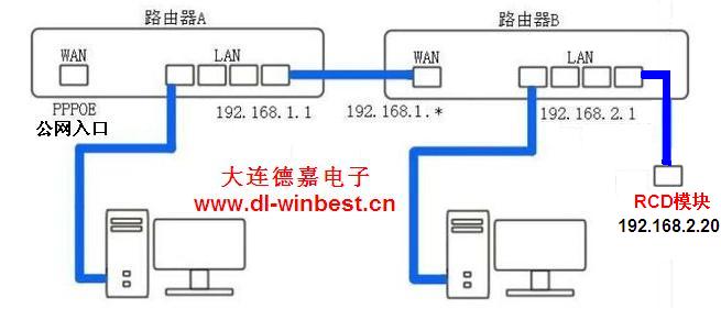 192.168.2.20(注意:需要先將RCD模塊的IP地址設(shè)置為192.168.2.20),再在路由器A中做端口1111映射為路由器B的WAN口IP地址192.168.1.*,