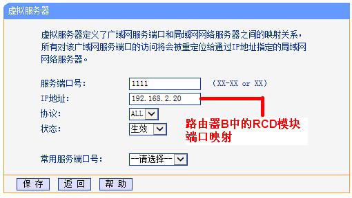 (一定要注意,這個(gè)是在路由器B中做的端口映射, RCD模塊是連接在路由器B上的)。