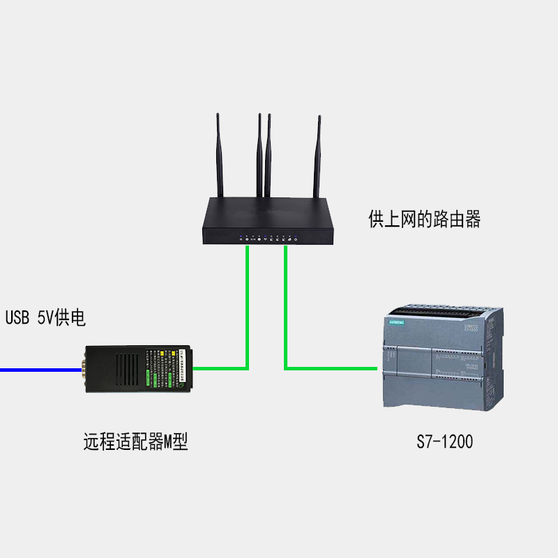 1、通過(guò)一對(duì)互聯(lián)網(wǎng)設(shè)備,遠(yuǎn)程適配器M型和RCD模塊,將遠(yuǎn)端的PLC拉近到局域網(wǎng)中。